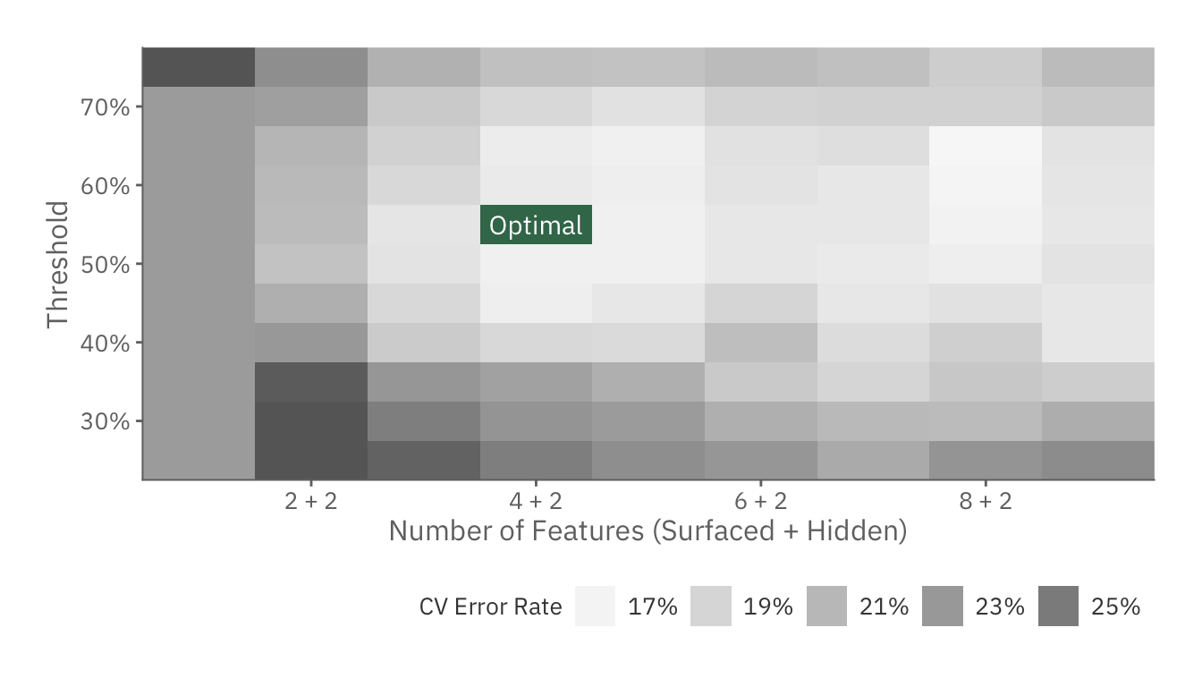 Based on the CV error rate, the optimal model is one with 4 + 2 features and 55% threshold.