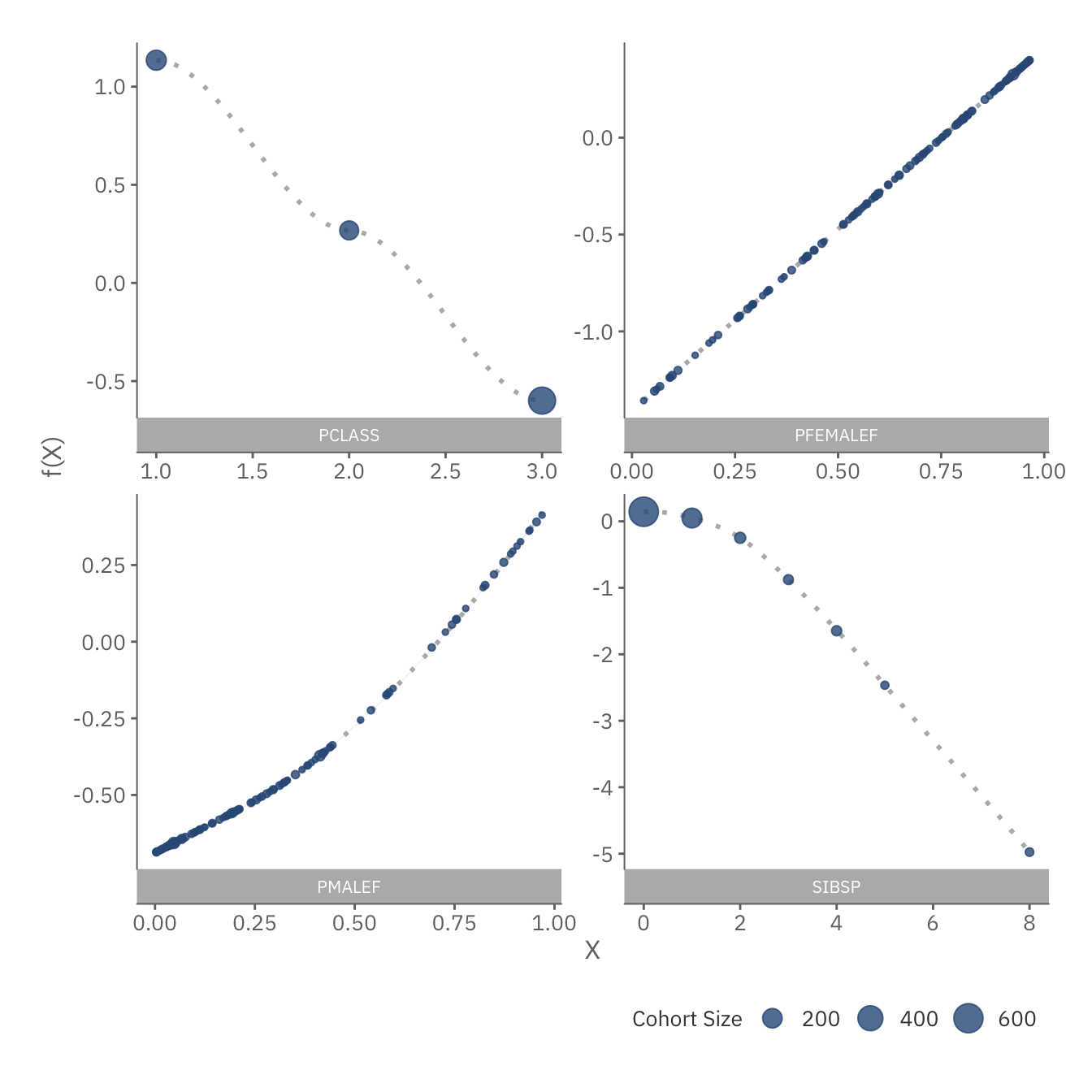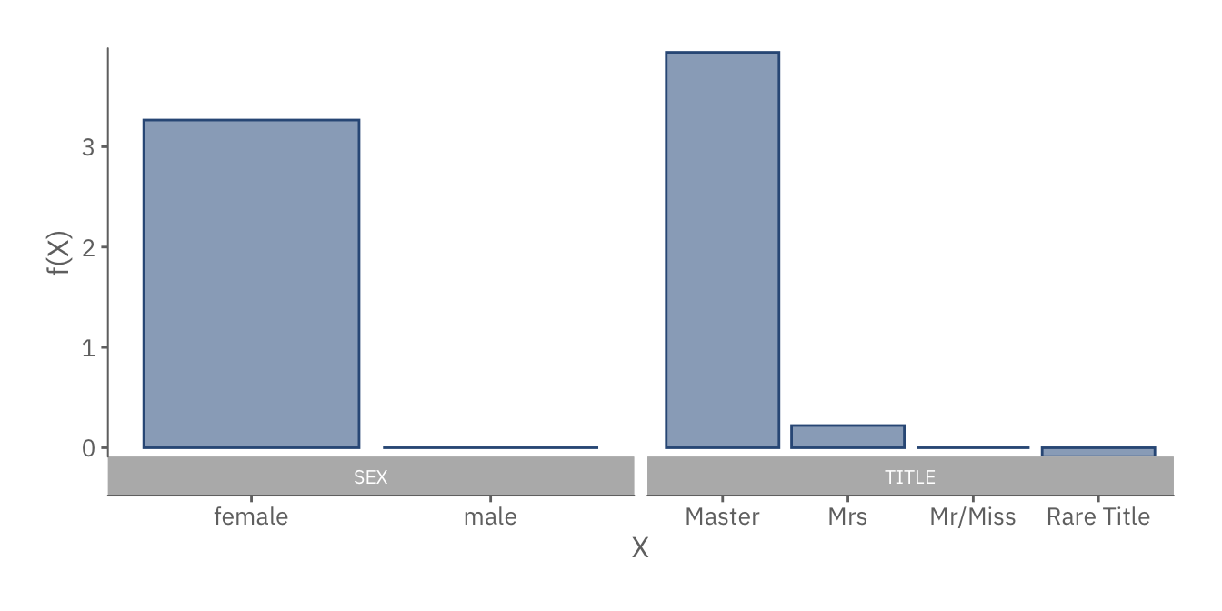 The plots above show the function \(f_i\) for each continuous feature. All 4 plots suggest a close to linear relationship for \(f_i\). This implies that linear models might perform relatively well too. It is also worth noting that having 1 or 2 siblings does not affect survivalhood significantly, but any more than that does.