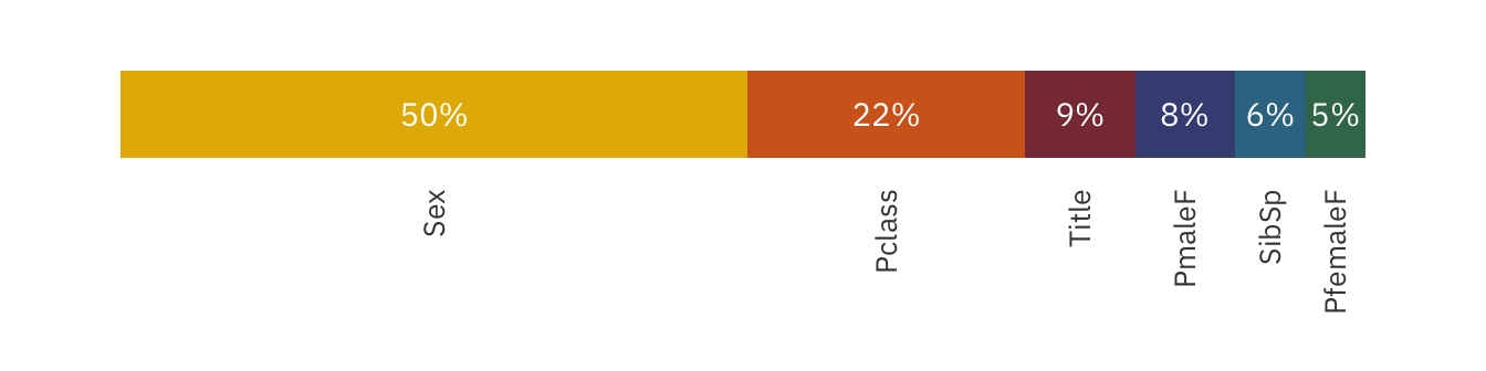 The chart above shows the strength of each feature relative to one another. As can be seen, both Sex and Pclass contribute over 60% to the prediction! This confirms our hypothesis that both Sex and Pclass are important factors of survivability.