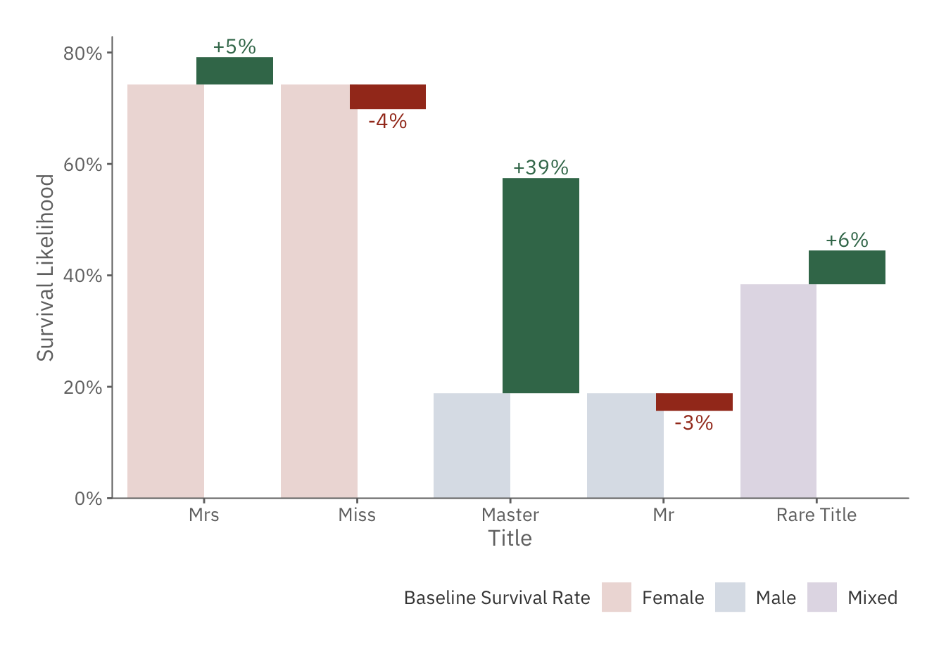 The Title of an individual is typically associated with his/her social status. We should expect those with higher titles to be given preference to lifeboats, and hence having higher survival likelihoods.