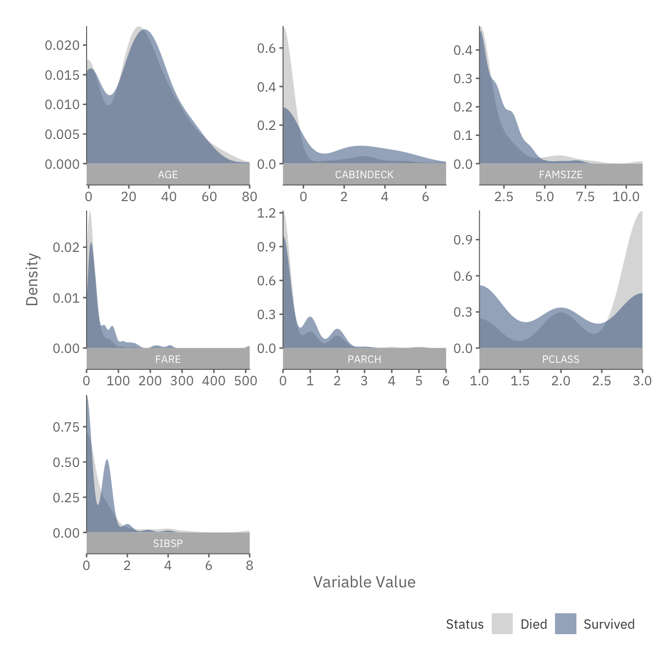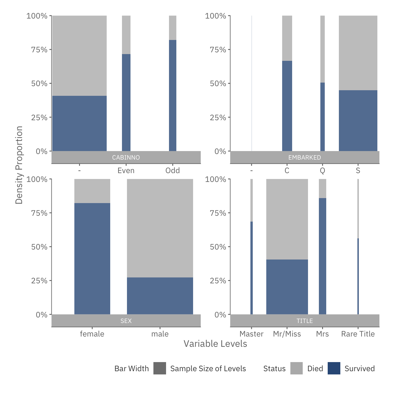 Similarly, the plots above show the equivalent for discrete features. As before, we can deduce that females and passengers with distinguished titles are more likely to survive.